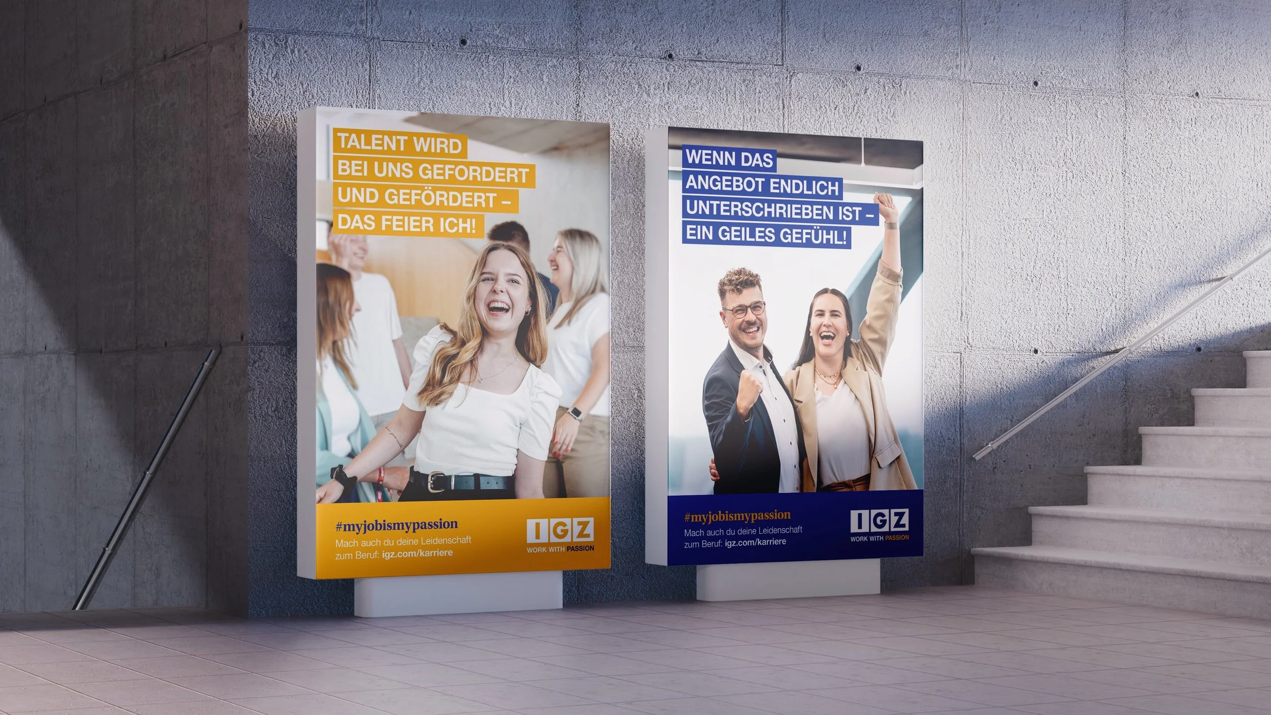 Unsere Analyse zeigte: Was die Mitarbeitenden bei IGZ verbindet, ist nicht nur die IT-Expertise, sondern die pure Leidenschaft für High-End-Lösungen und das gemeinsame Feiern von Erfolgen. Daraus entstand der Claim „IGZ. Work with passion.“ und das Kampagnenprinzip „#myjobismypassion“: ein emotionales System, das Spitzenleistung mit Lebensqualität verbindet.